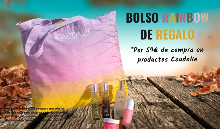 Consigue tu bolso rainbow por 59€ de compra en productos Caudalie incluyendo como mínim un aceite de tratamiento para cuerpo, cabello y escote con más de 95% de ingredientes de origen natural y apto para veganos.